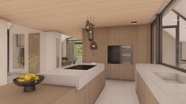 Dankzij de schuine daklijn, met overdekt terras, en de vele doorzichten, krijgt de woning een patio-achtige uitstraling.