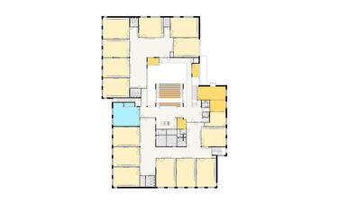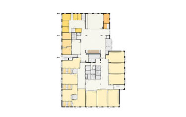 Binnen is het licht, ruim en overzichtelijk. Dankzij de grote overspanning van ruim 13 meter is de plattegrond eenvoudig aan te passen. Alle maatschappelijke ruimtes liggen in een halve cirkel rond de centrale hal en zijn daardoor goed bereikbaar.