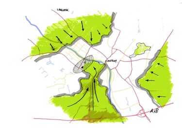 Het kantoor staat in een glooiend landschap, een groene zone ingeklemd tussen het stadscentrum en een bedrijventerrein. Het organisch gevormde gebouw vormt een buffer voor het kwetsbare landschap en behoedt het voor aantasting door verdere verstening.