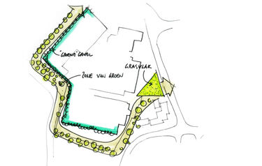 Door inpassing van groen in de vorm van een patio aan de achterzijde van het gebouw en plaatsing op een groen plateau maakt het gebouw letterlijk onderdeel uit van de groene zone.