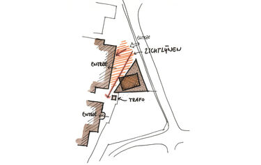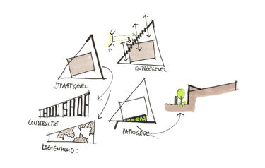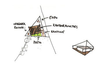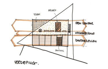 Het glazen kantoor is als een driehoekige stolp over een bestaand rechthoekig gebouw geplaatst dat dienst deed als opslagruimte. Daarvan is de bovenste verdieping gesloopt en de betonnen constructie hergebruikt. De driehoekige vorm is ontstaan vanuit de bouwlocatie, die in een punt loopt. Het nieuwe gebouw ligt parallel aan de straat, maar heeft een schuine zijde aan de kant van het binnenterrein. Vanaf de straatkant en de ingang van het bedrijfsterrein wordt zo het oog getrokken naar het 19e eeuwse gebouw, dat als onderdeel van de upgrade van het terrein door ons is gerestaureerd.