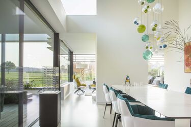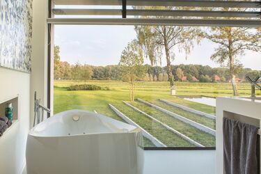 De geringe bouwhoogte van de woning versterkt de geleidelijke overgang tussen het villapark en het aangrenzende landschap.